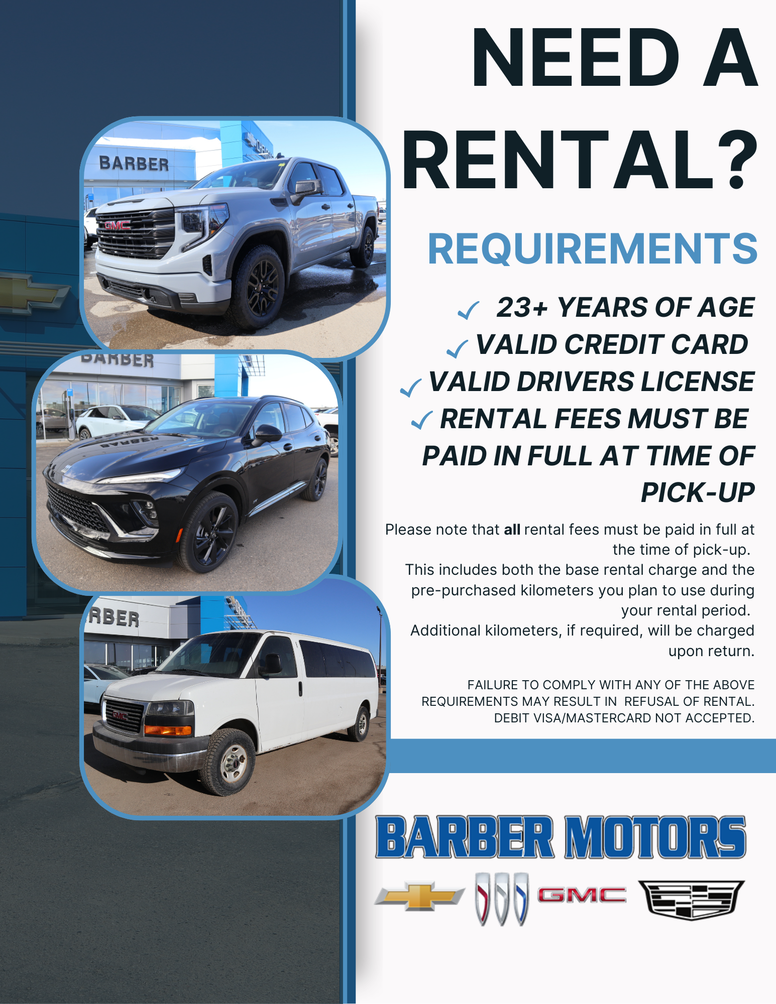 Please contact the Rental Department for pricing and available vehicles from SUV’s, Trucks & 15 Passenger Vans.